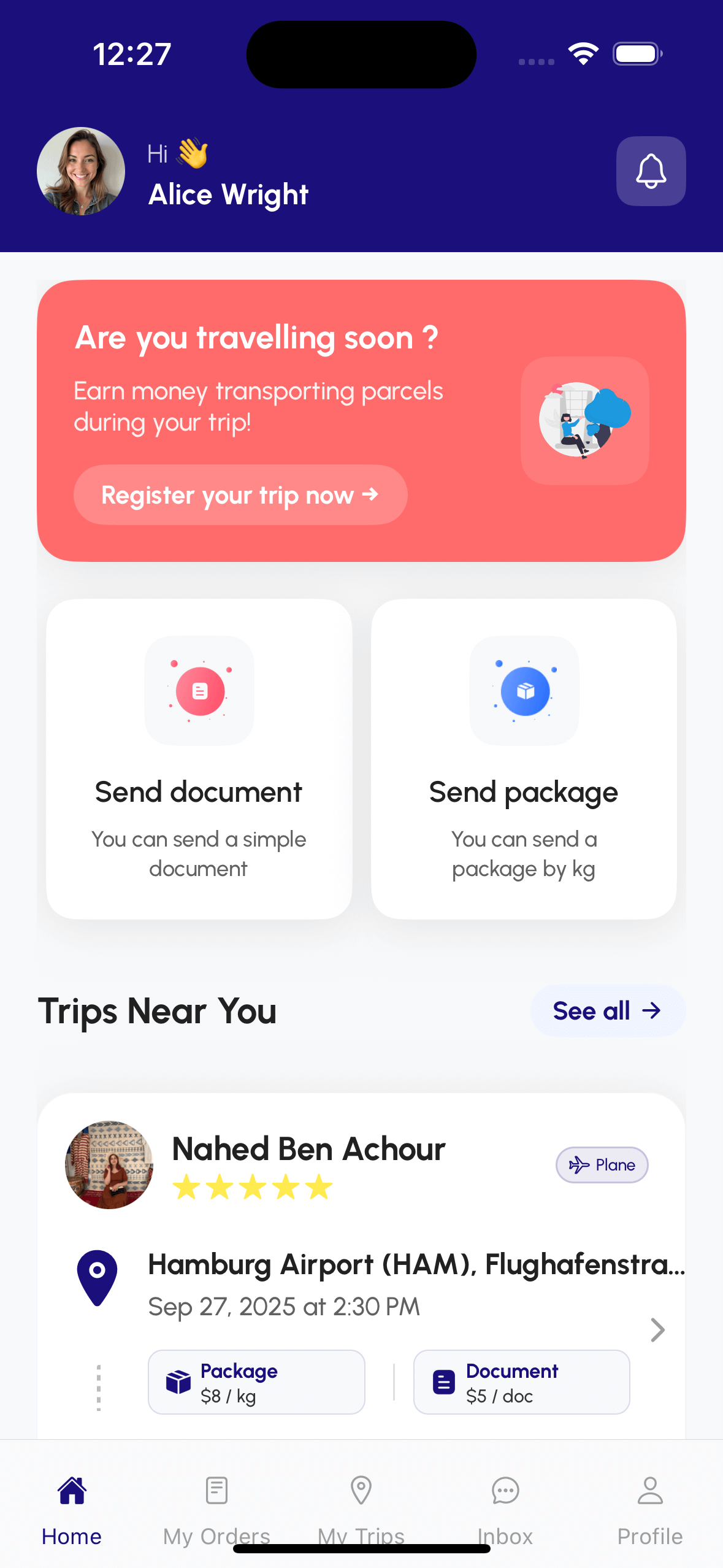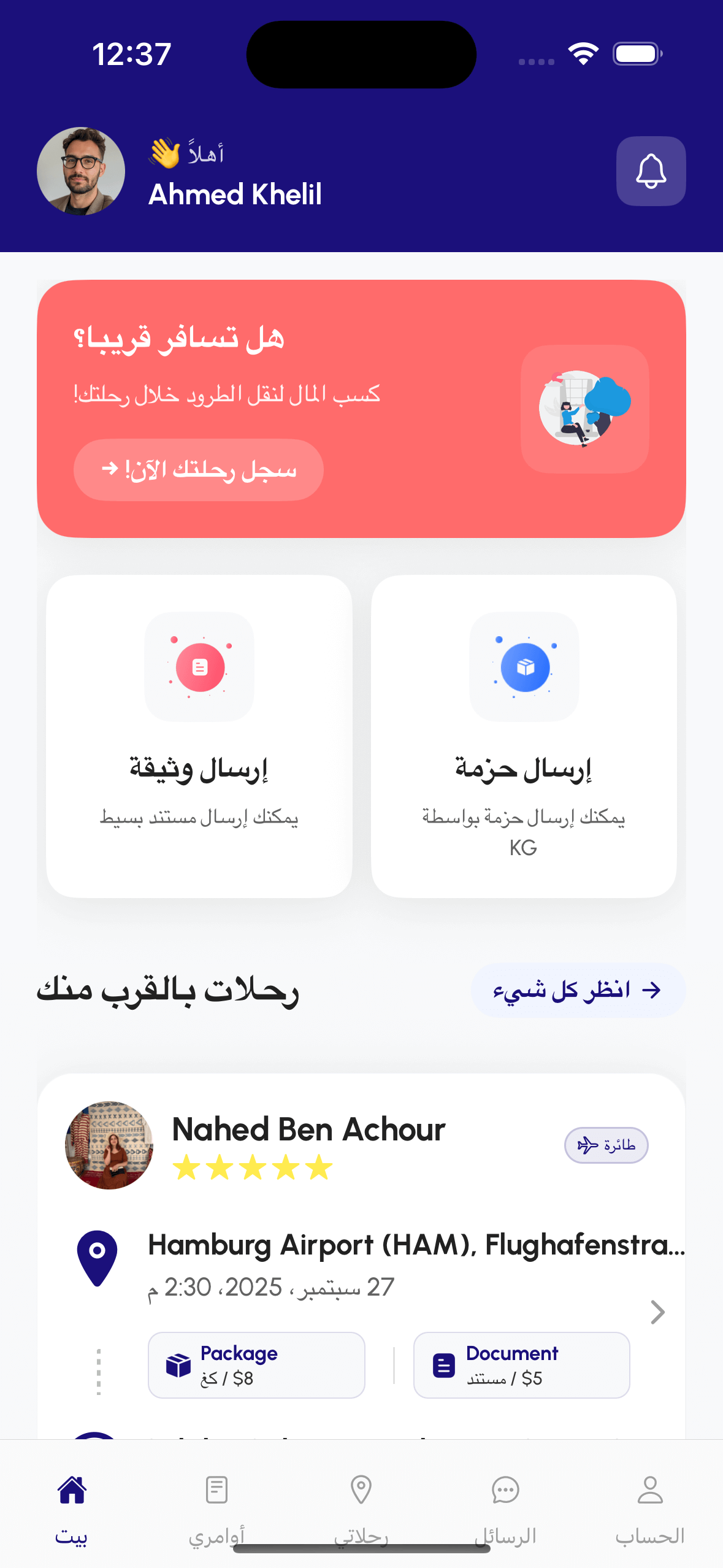 انشر تفاصيل رحلتك القادمة لتصبح ناقلاً. عندما يطلب شخص ما إرسال شيء عبر رحلتك، تحقق من هويتك أولاً، ثم اقبل أو ارفض. اكسب المال مقابل المساحة التي تسافر بها بالفعل.