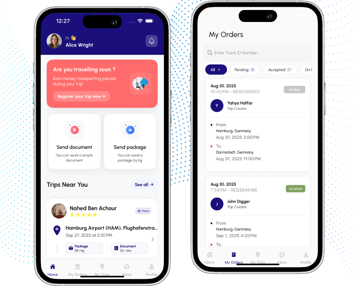 SendPal هو سوق موثوق حيث يتواصل المرسلون والمسافرون. انشر طلباً، ابحث عن تطابق، وأكمل عمليات التسليم بسهولة – كل ذلك مدعوم بمدفوعات آمنة وتواصل مباشر.